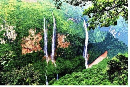 Dòng chảy ào ạt nhô ra từ sâu trong bụi rậm bên rìa vách đá, hợp thành bức tranh phong cảnh 3 thác nước vô cùng hùng vĩ.