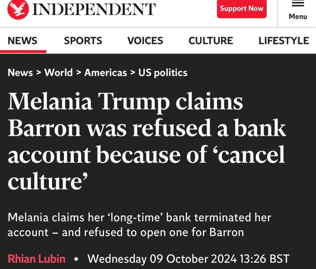 Melania tuyên bố ngân hàng lâu năm của bà đă chấm dứt tài khoản của bà và từ chối con trai bà, Barron, cơ hội mở tài khoản riêng.