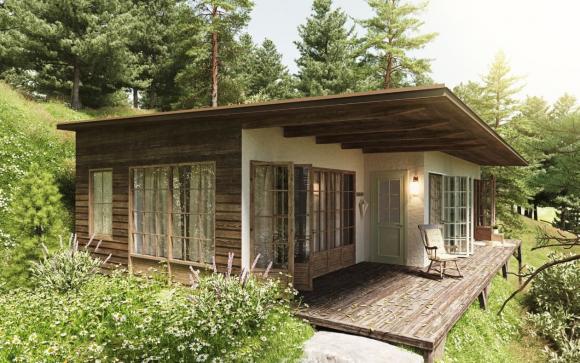 Căn nhà gỗ vào ban đêm sáng ánh đèn trông vừa lãng mạn vừa bí ẩn.
