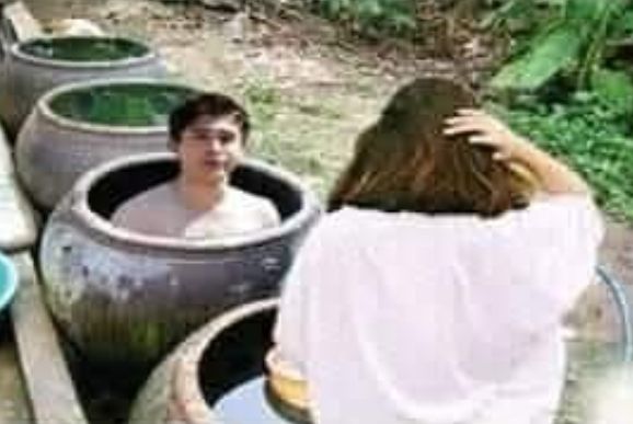Một hôm cô nàng quyết định qua nhà làm quen. Vì không có quần mặc nên anh không dám tiếp, nhưng cô gái cứ một mực đòi gặp anh. Cuối cùng anh đồng ý nhưng lại chui vào một cái lu và ló đầu ra để trò chuyện. Cô gái thấy lạ bèn hỏi: