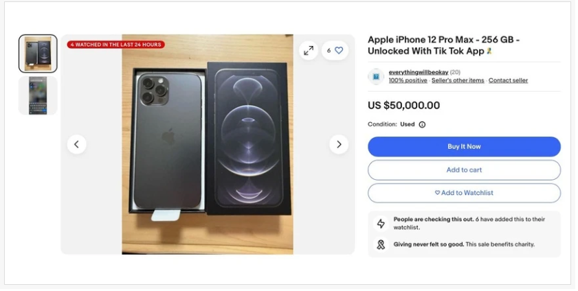 Một số mẫu thậm chí có giá 50.000 USD nếu mua dưới dạng Buy It Now (không cần đấu giá), như chiếc iPhone 12 Pro Max 256 GB. Nhiều smartphone khác được niêm yết từ 2.000-5.000 USD, song chưa rõ có ai thực sự mua hay không.