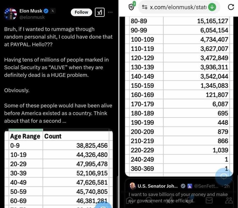 Elon Musk đã chỉ ra trong một bài đăng trên X rằng hàng triệu người được liệt kê trong cơ sở dữ liệu An sinh xã hội được ghi nhận là những người sống trăm tuổi "với trường tử vong được đặt thành False!" (false có nghĩa là sai, ngụy tạo, giả dối…).