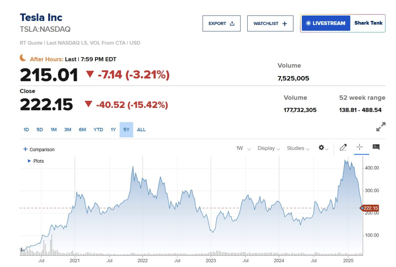 Tesla dẫn đầu đà giảm chung của chứng khoán Mỹ, kéo Nasdaq sụt gần 4% – mức giảm sâu nhất kể từ 2022. Áp lực lên cổ phiếu Tesla đến từ bất ổn quanh kế hoạch thuế quan của Tổng thống Donald Trump. Canada và Mexico là hai thị trường cung ứng ô tô lớn. Và hai quốc gia này có thể chịu tác động từ thuế tăng, dẫn đến nguy cơ đụng độ thương mại, ảnh hưởng sản xuất và đẩy giá xe tăng cao.