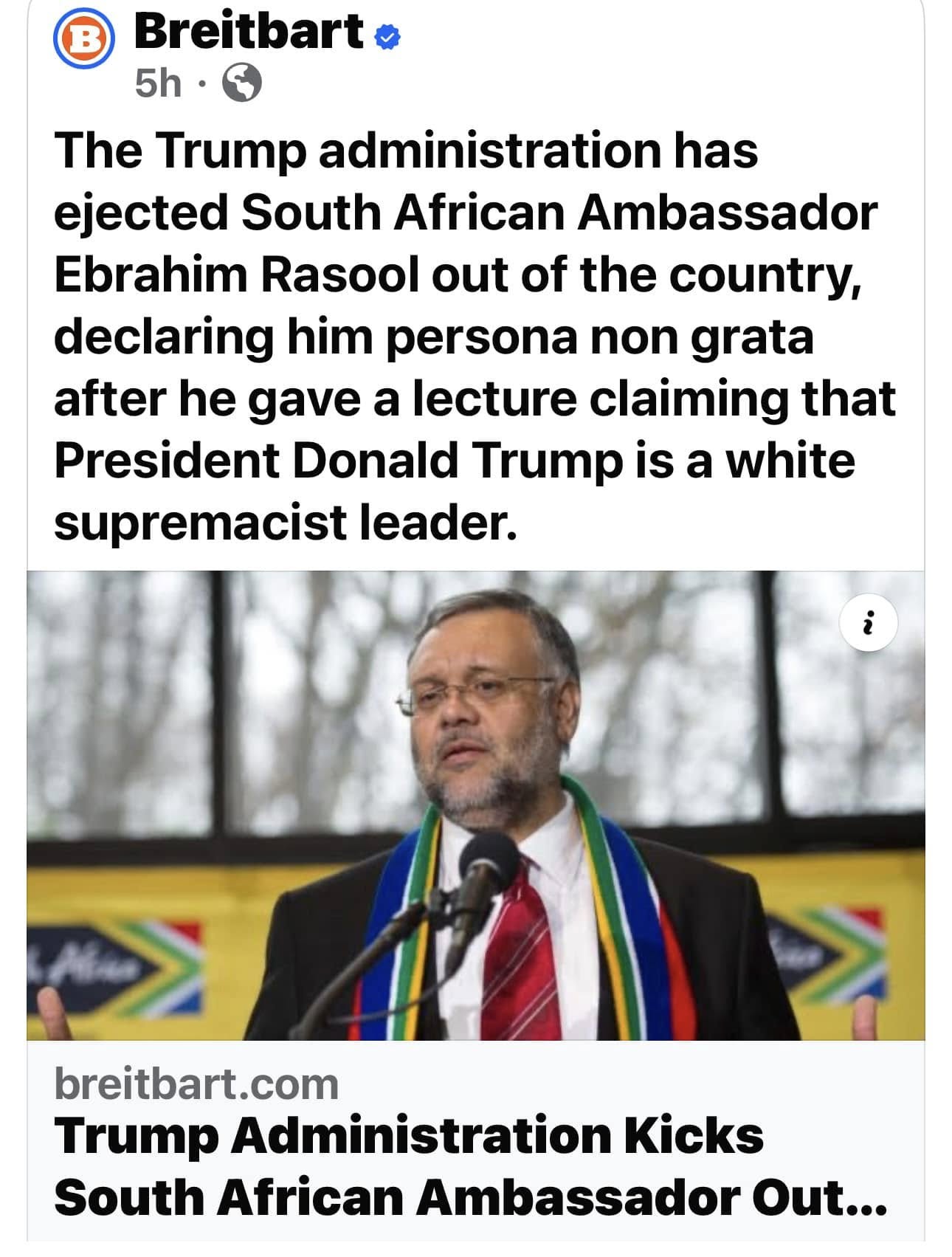 Chính quyền Trump đă trục xuất Đại sứ Nam Phi Ebrahim Rasool ra khỏi Hoa Kỳ