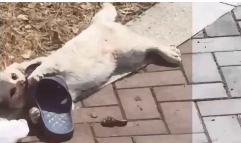 Chú mèo đáng thương chơi với một chiếc dép chỉ vài phút trước khi bị sát hại. Ảnh: Douyin.