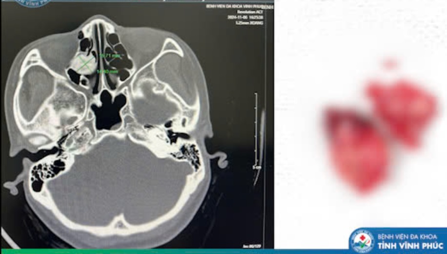 Người bệnh N.T.L.A (43 tuổi, ở Tam Dương - Vĩnh Phúc), có triệu chứng đau âm ỉ nửa đầu bên phải kéo dài, các triệu chứng này không thuyên giảm dù đã sử dụng thuốc điều trị bệnh lý thần kinh và xoang. Người bệnh đã được thăm khám chuyên khoa Tai Mũi Họng, thực hiện các xét nghiệm, chụp CT Scanner mũi xoang có hình ảnh u xương xoang sàng bên phải, kích thước khoảng 1.6x1.5cm.