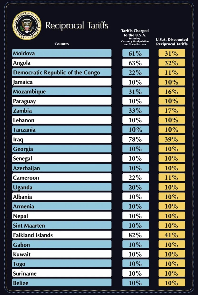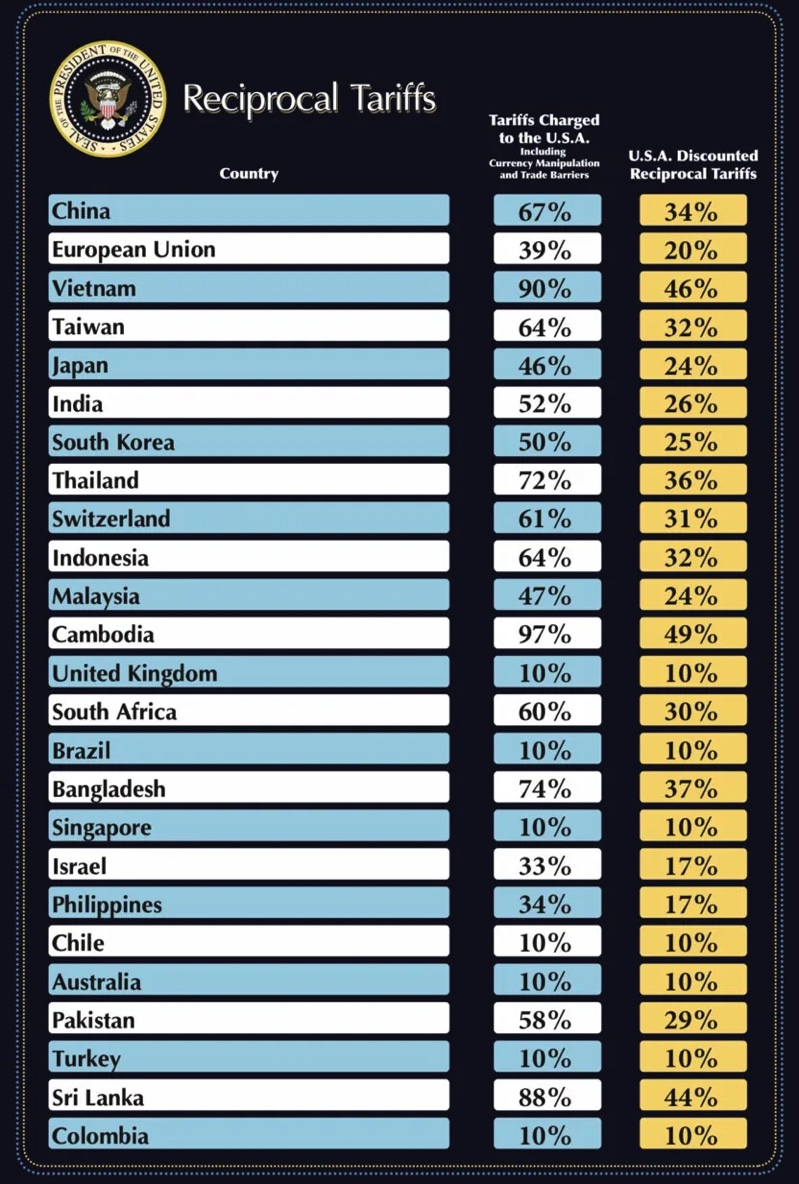 Trump just announced the following Tariffs for the following countries and a 10% baseline tariff on all others not listed.