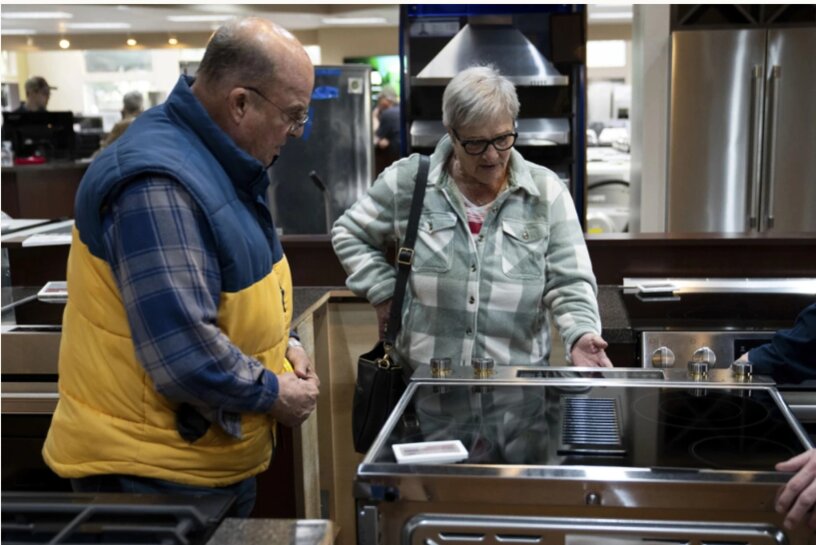 Ông Steve Hankins và Julie tìm mua đồ gia dụng ở Riegelmann’s Appliance ngày 3/4. Ảnh: AP