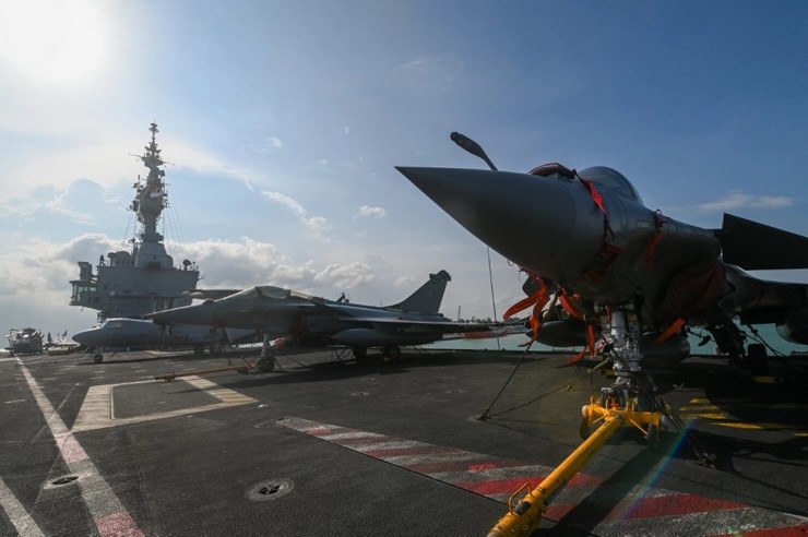 Chiến đấu cơ Rafale xuất hiện trên boong tàu sân bay hạt nhân Charles de Gaulle của Pháp. Ảnh: AFP.
