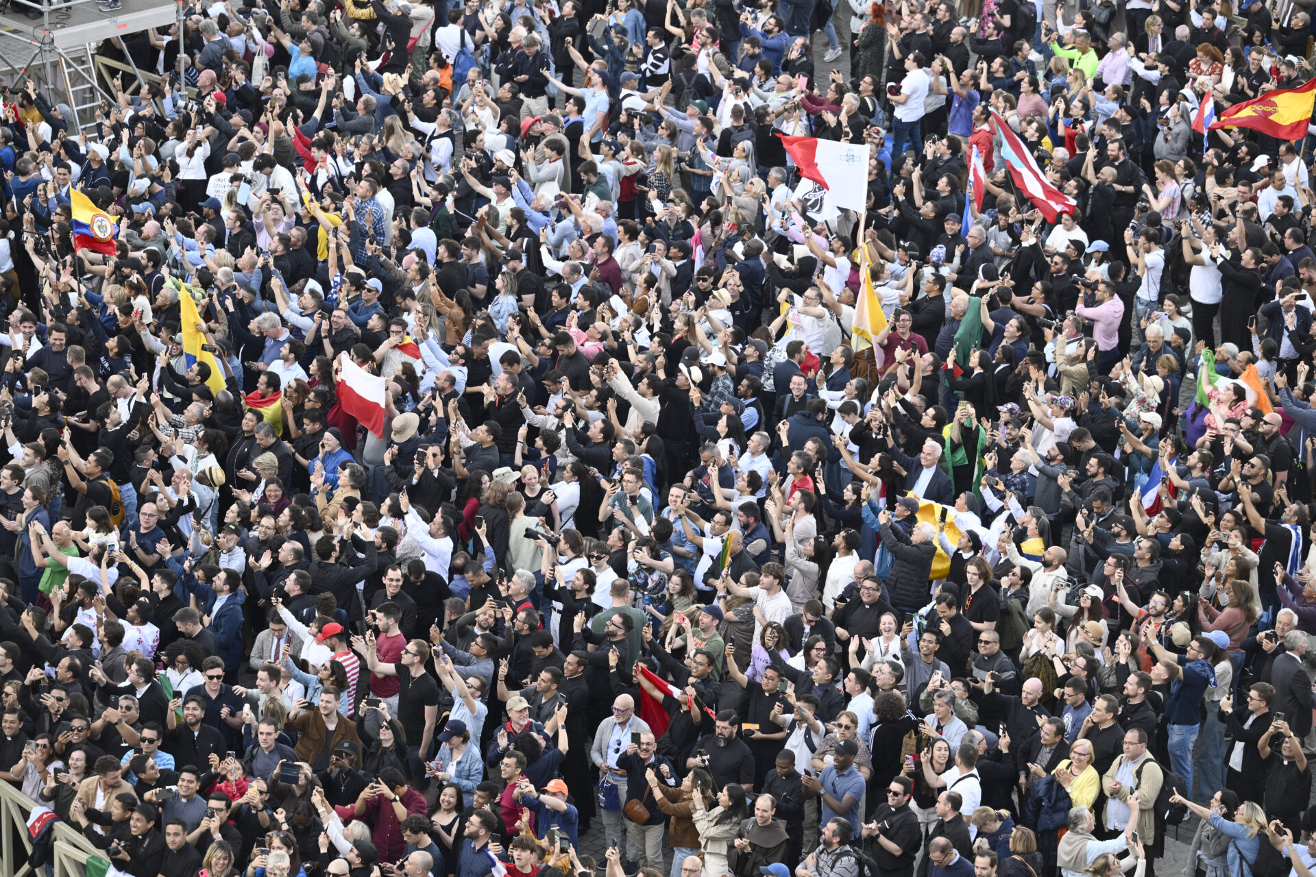 Đức Tân Giáo Hoàng Leo 14 trông rất xúc động khi đứng vẫy chào tín đồ trên quảng trường.