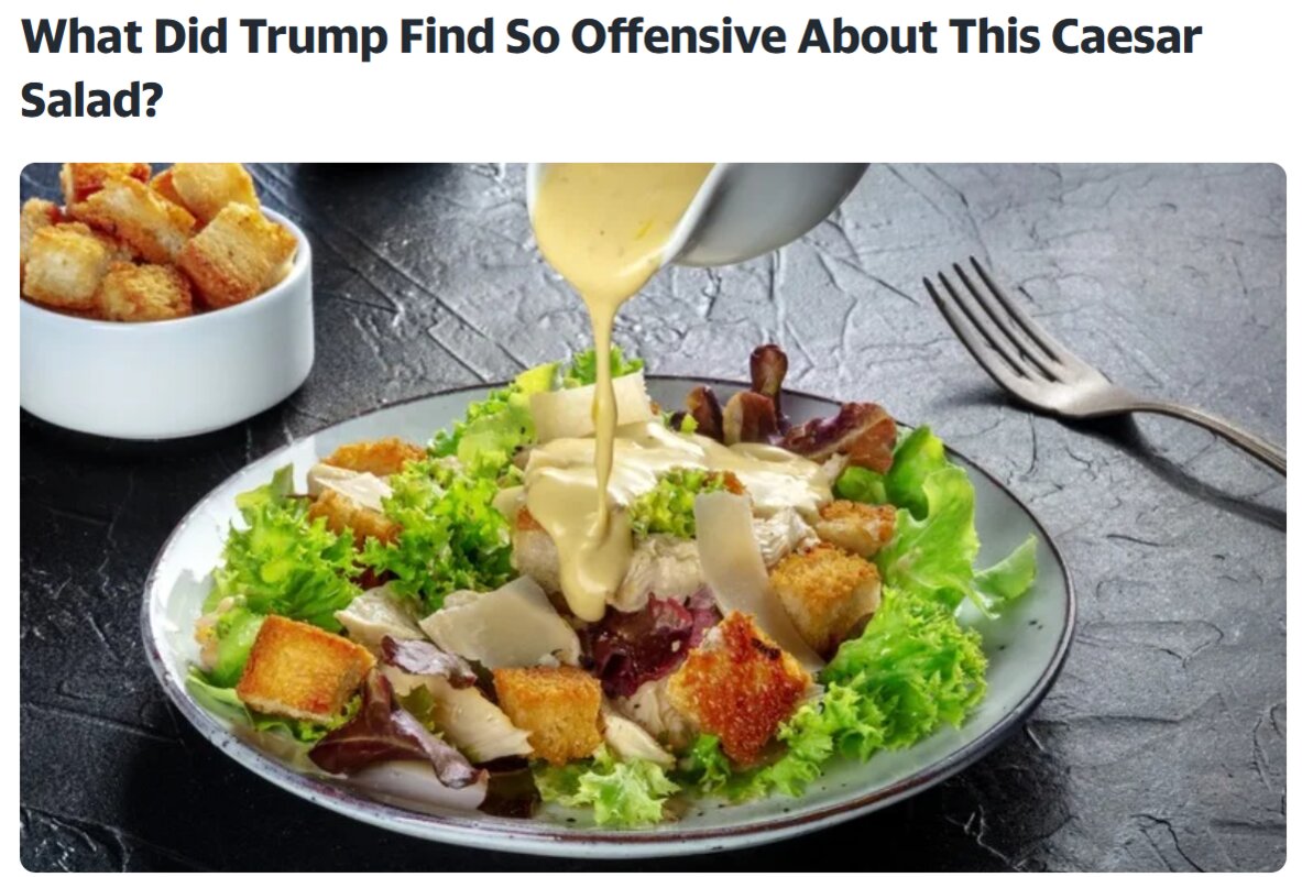 Salad Caesar là món ăn đơn giản nhưng ngon miệng bao gồm rau diếp Romaine, bánh mì nướng và nước sốt mặn có mù tạt Dijon, nước cốt chanh, sốt Worcestershire, cá cơm và lòng đỏ trứng cùng nhiều nguyên liệu khác. Không rõ tại sao Donald Trump lại tỏ ra khó chịu với món salad Caesar của đầu bếp cũ, nhưng câu trả lời có thể liên quan đến thói quen ăn uống ám ảnh đồ ăn nhanh của Tổng thống.