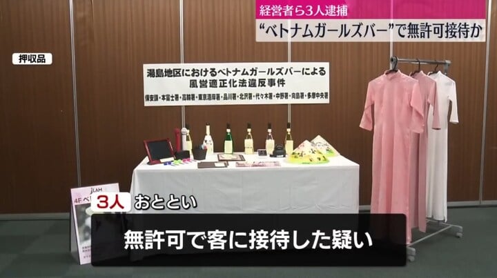 Theo như có nhiều nữ nhân viên người Việt bị phát hiện đă tiếp khách trong trang phục áo dài mà không hề có giấy phép của 'quán bar áo dài' của người Việt ở khu Yushima, quận Bunkyo, v́ hoạt động không phép khiến cảnh sát Tokyo đă công bố việc bắt giữ ba phụ nữ, trong đó có chủ quán bar người Việt ở khu này.