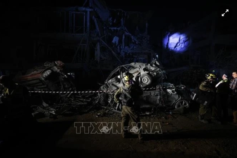 Lực lượng phản ứng nhanh Israel tại hiện trường bị trúng tên lửa của Iran ở miền Trung Israel, tối 13/6/2025.