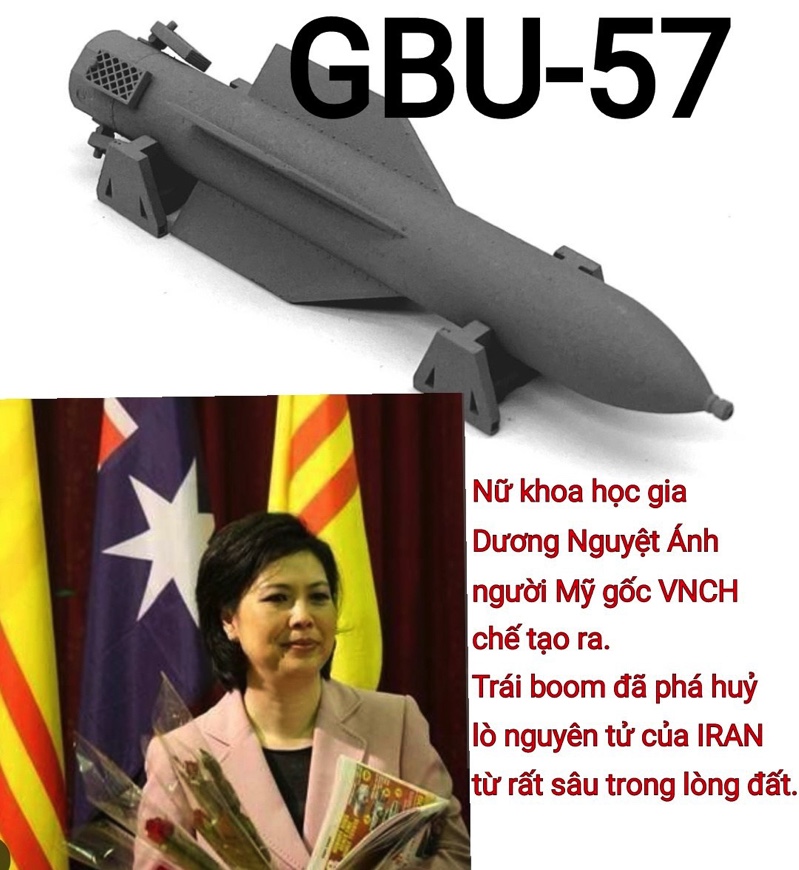 Cái này của bà Dương Nguyệt Ánh là bom nổ ,còn bom miện của Ma de in Việt Nam là cầm súng CKC bắn rớt máy bay B52 và cầm gậy bắt sống tên giặc lái Mc Cain, thật là kinh khủng hơn bom GBU-57 của bà Dương Nguyệt Ánh