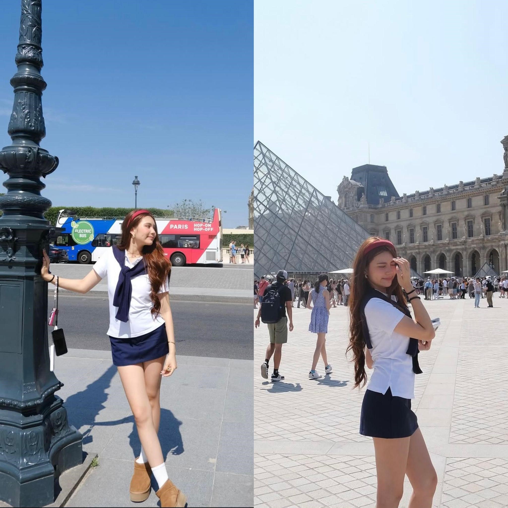 Thiếu nữ tuổi teen tạo dáng trên phố Paris trong set đồ trẻ trung, nổi bật với chân váy ngắn tôn lên đôi chân thon dài.
