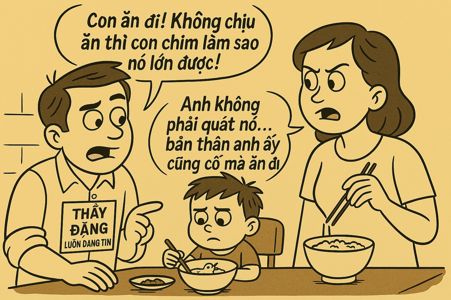– Con ăn đi! Không chịu ăn thì con chim làm sao nó lớn được!