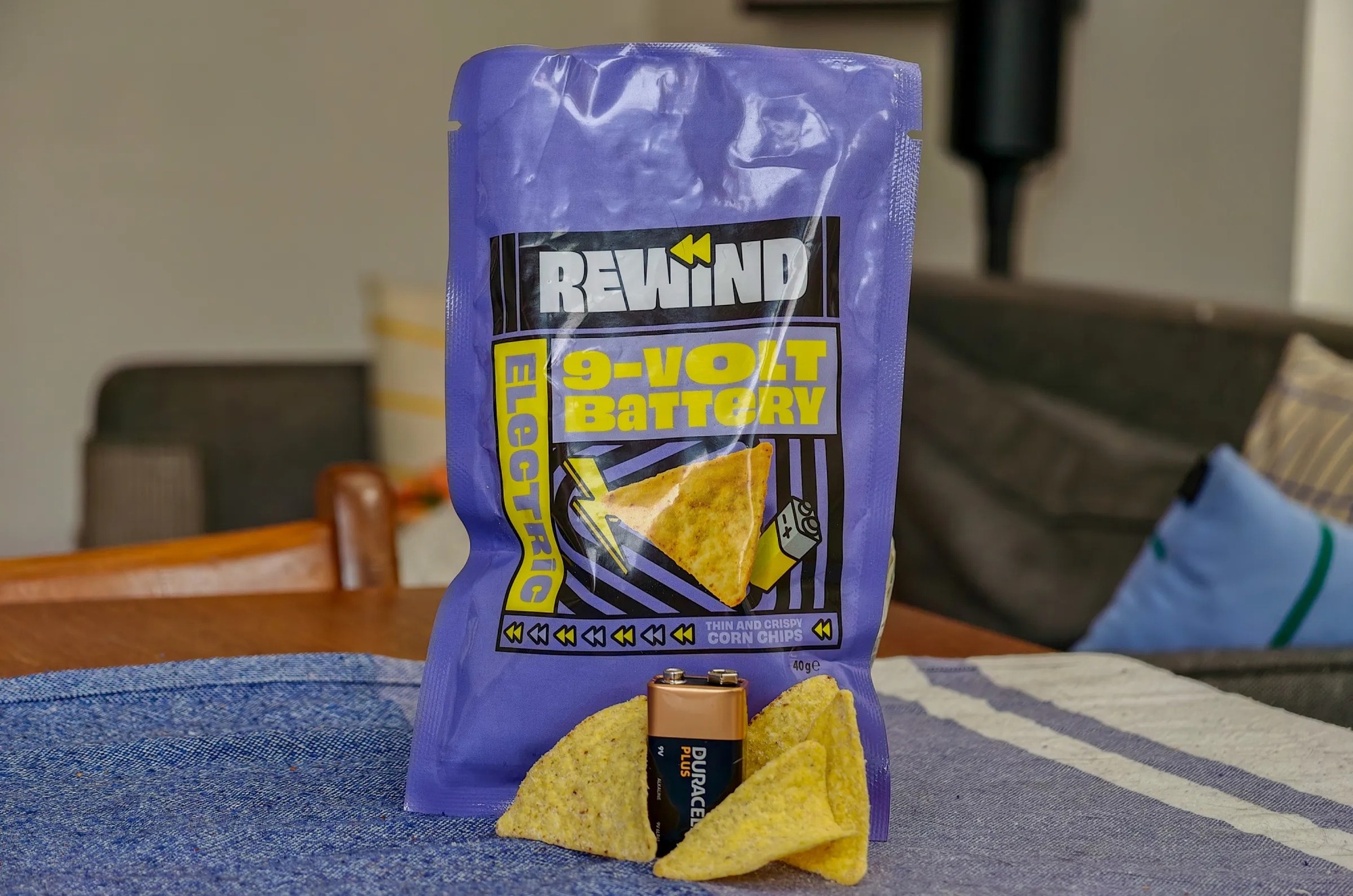Bạn từng nghịch dại mà liếm vào đầu cục pin 9V? Nếu có, bạn sẽ hiểu cảm giác tê rát, chua kim loại đặc trưng ấy khó quên đến mức nào. Và giờ, một thương hiệu snack có tên Rewind vừa biến trải nghiệm ấy thành một hương vị... ăn được.