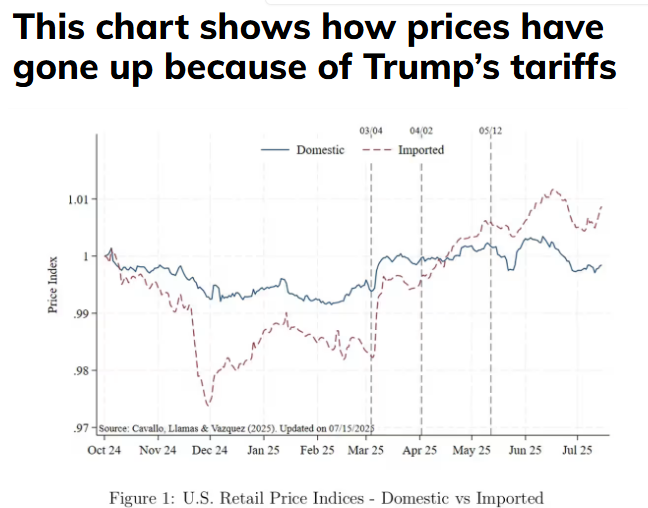 Giá hàng nhập khẩu "phản ứng tương đối nhanh với các thông báo về thuế quan", mặc dù "quy mô tổng thể của những thay đổi này vẫn còn khiêm tốn", một nhóm các nhà kinh tế do Alberto Cavallo dẫn đầu và liên kết với Phòng thí nghiệm Định giá HBS cho biết. Phát hiện này được thể hiện trong biểu đồ trên. Các thông báo về thuế quan được nêu bật trong biểu đồ bao gồm việc Trump áp đặt các mức thuế mới đối với Canada, Mexico và Trung Quốc vào ngày 4 tháng 3; việc ông triển khai các khoản thuế "ngày giải phóng" vào ngày 2 tháng 4; và thỏa thuận của chính quyền ông với Trung Quốc vào ngày 12 tháng 5, trong đó giảm thuế quan cho quốc gia đó.