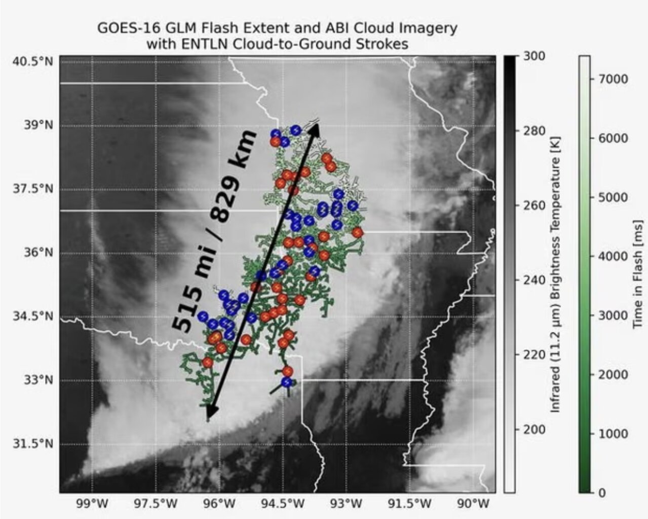 Tia sét 829 km này kéo dài từ bang Texas đến gần thành phố Kansas, xảy ra vào ngày 22/10/2017 tại vùng Great Plains - nơi được coi là "điểm nóng" về dông bão ở Mỹ. So với kỷ lục trước đó là 768 km, cũng được ghi nhận tại khu vực này vào tháng 4/2020, tia sét năm 2017 dài hơn gần 50 km. Khoảng cách 829 km tương đương quãng đường từ Paris (Pháp) tới Venice (Italy).