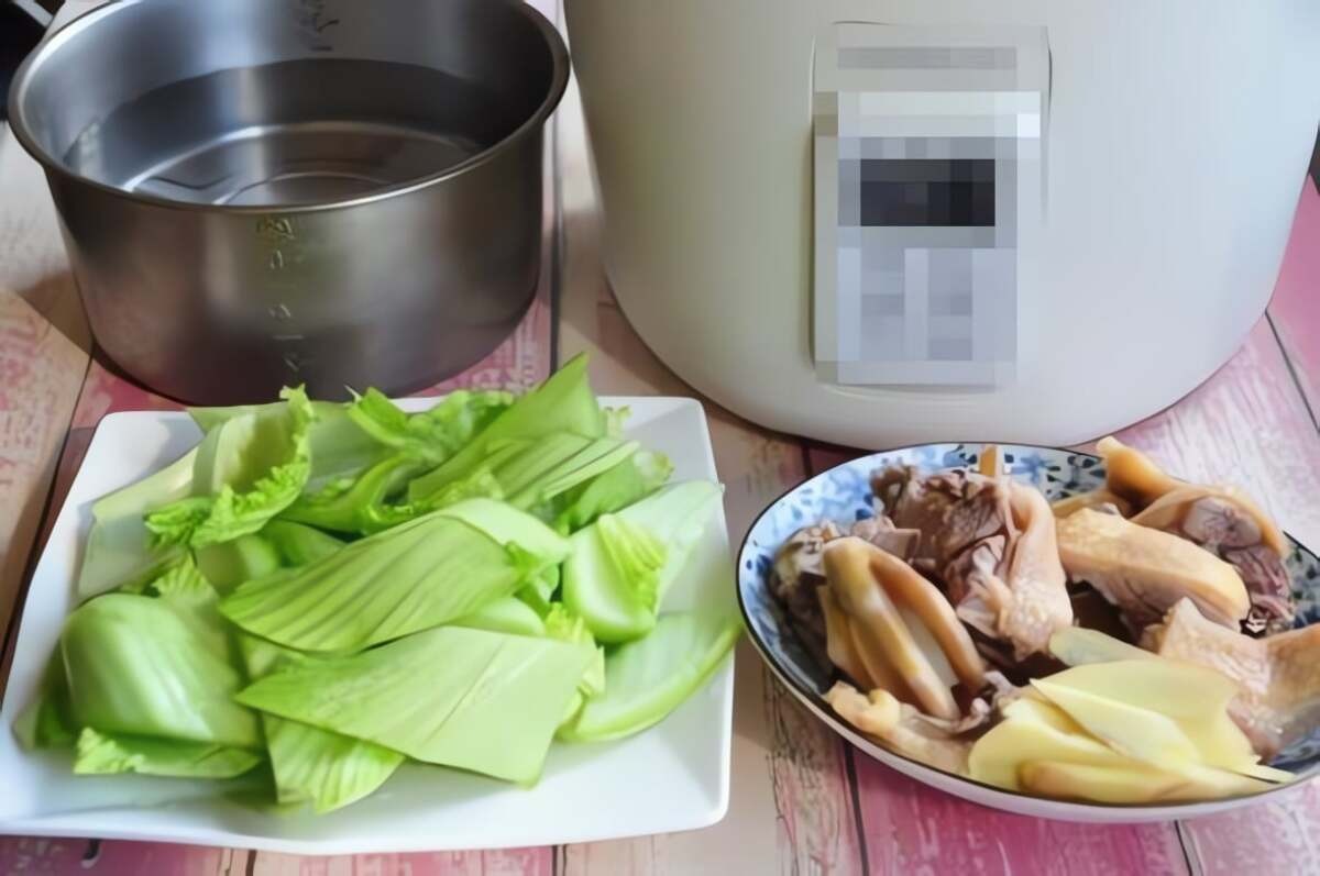 Cho thịt vịt, phần thân cải bẹ non và gừng vào nồi.