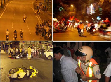 Những tụ điểm “nóng” như đường Lý Thường Kiệt, quận Tân Bình, đường Thành Thái, quận 10, đường Điện Biên Phủ, quận Bình Thạnh…lại náo nhiệt với đủ các trò đua xe, lạng lách, đánh võng, nẹt pô…khi trời rạng sáng để trổ tài, nhằm thỏa mãn cảm giác mạnh đến… chết người.