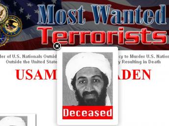Ảnh chụp trang Web của cơ quan an ninh Mỹ FBI ngày 02/05/2011, với ghi chú "deceased" (đã chết) phía dưới ảnh của Oussama Ben Laden.