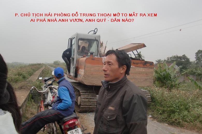 Ông Đỗ Trung Thoại nói do dân bất bình nên phá nhà ông Đoàn Văn Vươn ở xã Vinh Quang, Tiên Lãng. Tuy nhiên, ông Lê Thanh Liêm, chủ tịch UBND xã Vinh Quang, khẳng định do đoàn cưỡng chế thực hiện.
