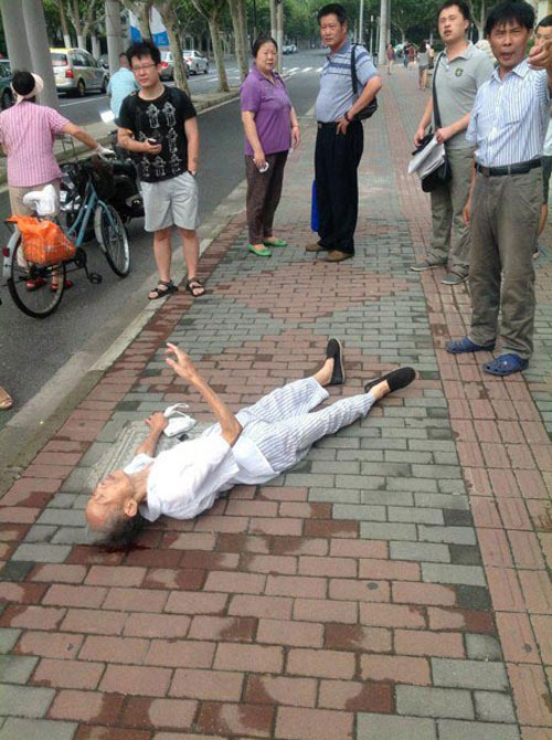 Đằng sau câu chuyện để mặc cụ già bị ngã vỡ đầu trên phố (một đường phố nào đó ở Trung Quốc) còn một câu chuyện dài, đó là có một phụ nữ phương Tây, không chịu nổi cảnh đau lòng đó, đã vừa khóc vừa rút tiền ra nhờ người gọi xe cứu thương đến chở cụ già đi.