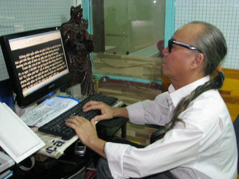 Nhà thơ mù bên bàn viết.
