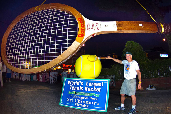 Chiếc vợt tennis khổng lồ là một sản phẩm mới của nhà thiết kế Ashrita Furman, người hiện nắm giữ 151 kỷ lục thế giới, nhiều hơn bất kỳ ai khác.
