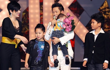 Vợ và 3 con trai lên sân khấu ủng hộ Bằng Kiều