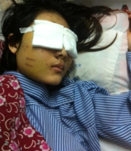 Gương mặt bị vết thương do đầu đạn súng hoa cải bắn, còn đôi mắt đã bị phá hủy hoàn toàn. Không có khả năng phục hồi cũng như thay ghép.