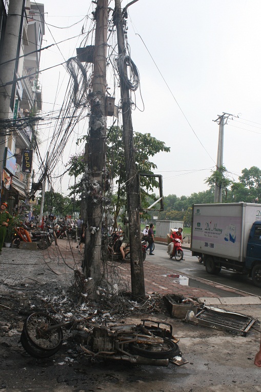 Hà Nội: Cột điện bốc cháy ngùn ngụt thiêu rụi xe máy