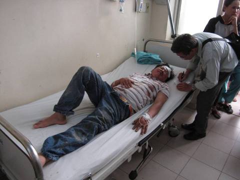 Anh Sinh bị chấn thương ở vùng đầu và tay, anh nói mà nước mắt cứ muốn tuôn rơi trên khuôn mặt sưng húp.
