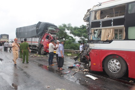 Xe tải “đấu đầu” xe khách giường nằm kinh hoàng trong mưa
