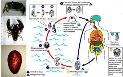 Ở cua, tôm, ấu trùng sán lá phổi ký sinh dưới dạng nang trùng ở cơ ngực. Sau thời gian từ 45 - 54 ngày xâm nhập cua, tôm; nang trùng có thể có khả năng gây nhiễm bệnh cho con người.