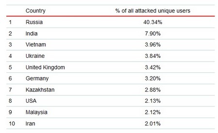 Một điều rất đáng lo ngại với người dùng tại Việt Nam khi báo cáo của Kaspersky cho biết Việt Nam nằm trong top các quốc gia hàng đầu có lượng người dùng di động bị tấn công, bao gồm Nga (40% tổng số lượng người dùng di động), Ấn Độ (8%), Việt Nam (4%), Ukraine (4%) và Anh (3%).