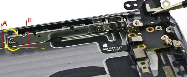 "Điều này có nghĩa là thanh kim loại được thêm vào không có khả năng hấp thụ lực tác động quá gần con ốc, bởi nó không có bất kỳ điểm trọng yếu nào khác để bám lấy, do đó nó bị xoay theo hướng lực tác động"– alleras4 cho hay. Còn đây là hình giải thích của iFixit: