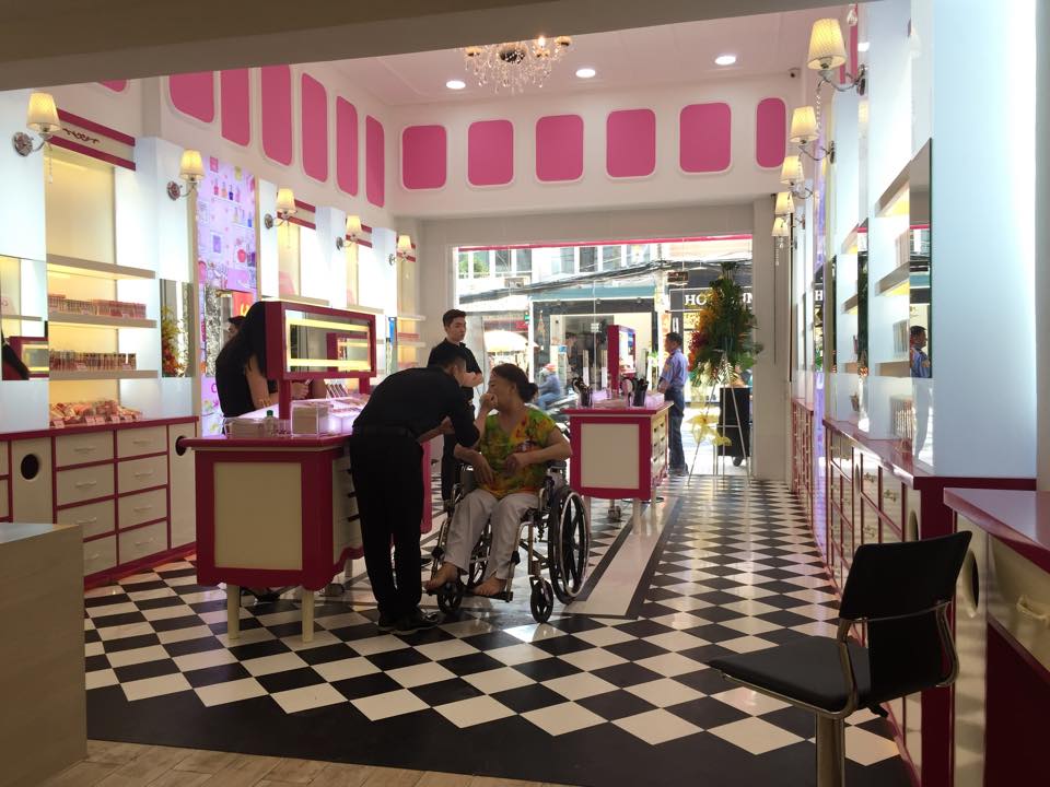 Vì cửa hàng TBS rộng lớn hơn những chi nhánh khác nên chúng tôi còn có bàn trang điểm để các "makeup artist" chuyên nghiệp của TBS có thể tư vấn và hướng dẫn từng khách hàng cách trang điểm cho phù hợp với khuôn mặt của quý vị.