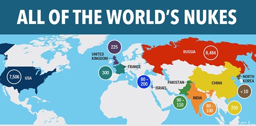 Theo đó, tính đến năm 2014, trên thế giới có 10 quốc gia hạt nhân, trong đó mạnh nhất là hai cường quốc Nga và Mỹ với khoảng 8.500 và 7.500 đầu đạn hạt nhân. Tiếp đến là 3 cường quốc Anh, Pháp và Trung quốc tương đương nhau với số đầu đạn 225, 300 và 250.