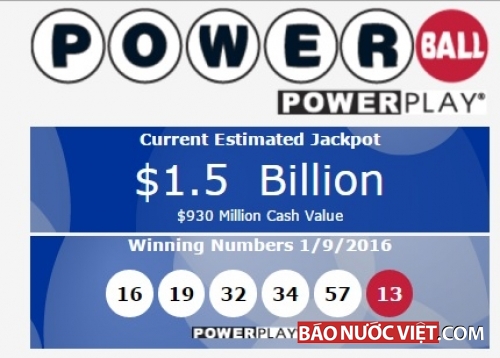 Trong đợt xổ số Powerball tối Thứ Bảy 09-1-2016 vừa qua, lô độc đắc được xổ ra gồm các số 16, 19, 32, 34, 57 và số Powerball 13. Nhưng không có ai trúng trong tổng số 292,201,338 vé số đã được bán ra. Như vậy là có quyền tiếp tục hy vọng.