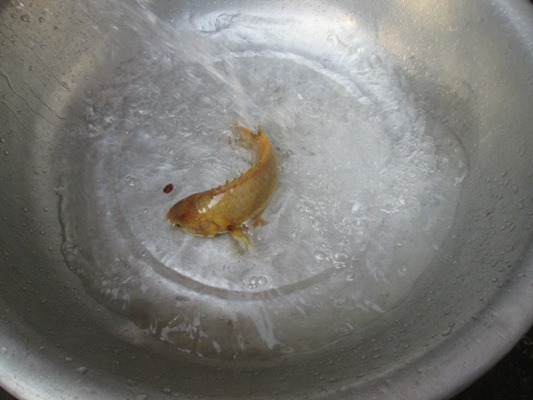 Thật bất ngờ sau khi rửa giỏ cá ngoài đồng, ông Khôi phát hiện một con cá rô màu vàng rất đẹp mà mình bắt được.