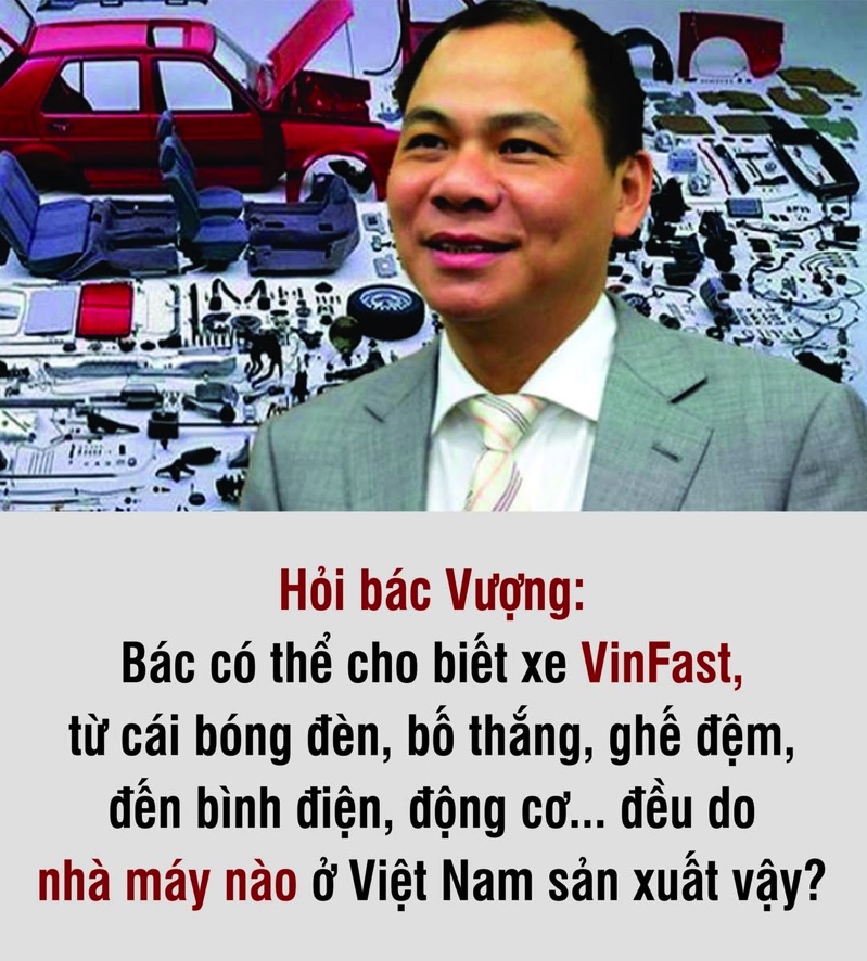 Bác Vượng quảng cáo xe VinFast là xe do chính Việt Nam sản xuất. Tuy nhiên, có tin đồn rằng Việt Nam không có phụ tùng nào trên xe VinFast, mà hầu hết các phụ tùng đều là hàng của các công ty xe nước ngoài, đặc biệt là phụ tùng từ Trung Quốc chiếm đa số. Không biết có phải vậy không, bác Vượng?