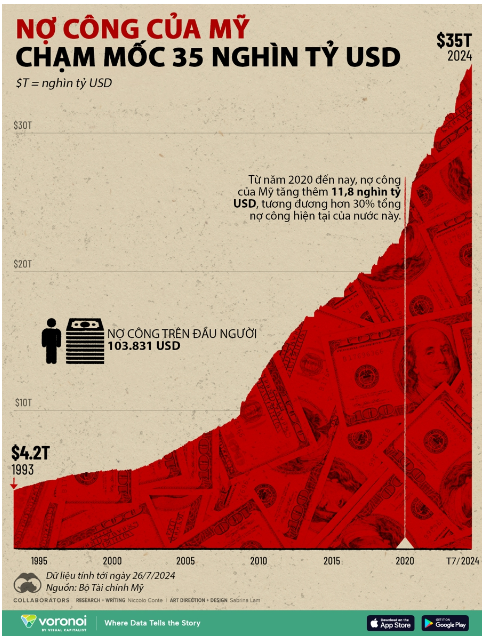 Tình trạng nợ công của Mỹ kể từ năm 1993 đến nay, dựa trên dữ liệu từ trang Fiscal Data của Bộ Tài chính Hoa Kỳ.