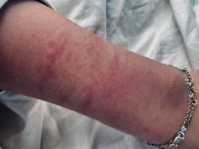 Tay của nạn nhân H bị bầm đỏ được cho là do chống cự khi bị nạn. Ảnh: NVCC.
