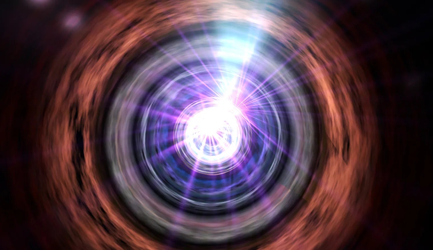 Chuẩn tinh vốn có bản chất là một lỗ đen đang ngấu nghiến vật chất, tạo ra một vùng hỗn loạn quanh nó với các cú "ợ hơi" rực sáng.