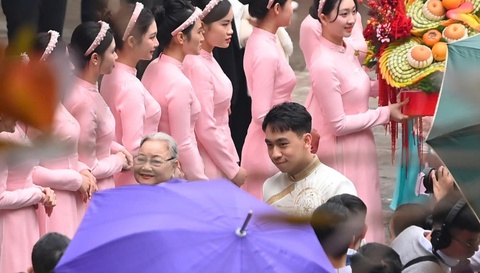 An ninh được thắt chặt với đông vệ sĩ. Đội ngũ vệ sĩ dùng ô che chắn từ ngoài đường lớn vào trong tận nhà riêng cô dâu. Chú rể Phạm Nhật Minh Hoàng diện áo dài truyền thống trong ngày trọng đại. Phía nhà trai mang nhiều mâm sính lễ kết trái cây, hoa tươi tạo hình rồng, phượng. Dàn phù rể, phù dâu đều mặc áo dài màu hồng truyền thống.