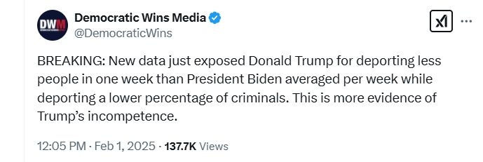 “TIN MỚI NHẤT: Dữ liệu mới vừa tiết lộ Donald Trump trục xuất ít người hơn trong một tuần so với mức trung bình của Tổng thống Biden mỗi tuần trong khi trục xuất tỷ lệ tội phạm thấp hơn. Đây là bằng chứng nữa cho thấy sự bất tài của Trump. “ Xem hình.