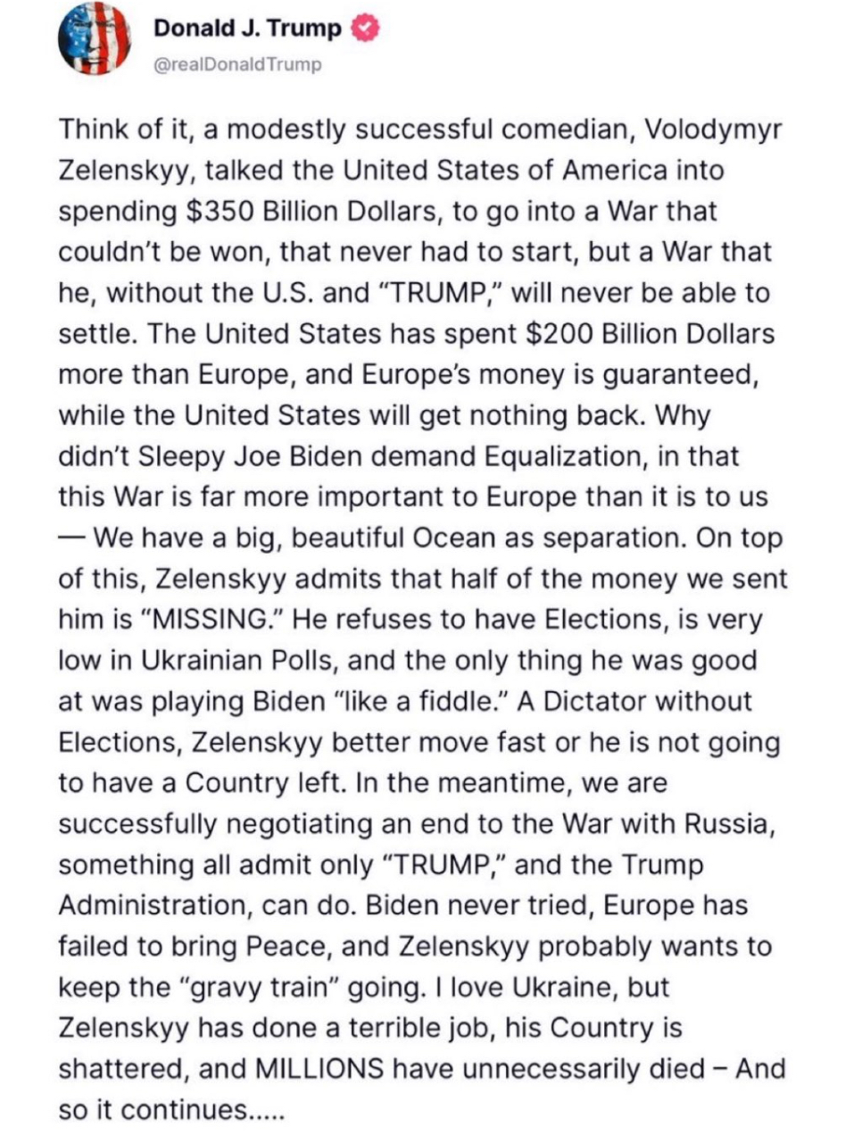 Tổng thống Trump nói đúng—Zelenskyy đã lợi dụng Biden như một cái máy rút tiền, và Ukraine đã rút cạn 350 tỷ Dollar của Hoa Kỳ trong một cuộc chiến tranh lẽ ra không bao giờ nên leo thang. Biden thậm chí không bao giờ cố gắng đàm phán hòa bình, mù quáng chuyển tiền thuế của người dân Hoa Kỳ vào một cuộc xung đột khiến Ukraine tan vỡ và hàng triệu người chết. Trong khi đó, Châu Âu, nơi có nhiều rủi ro hơn, đã đóng góp chỉ khoảng 150 tỷ Dolllar , ít hơn rất nhiều so với sự đóng góp của Hoa kỳ và họ muốn rằng tiền của họ được bảo vệ và đối trọng , trong khi Hoa Kỳ sẽ không bao giờ thấy một xu nào đổi lại.