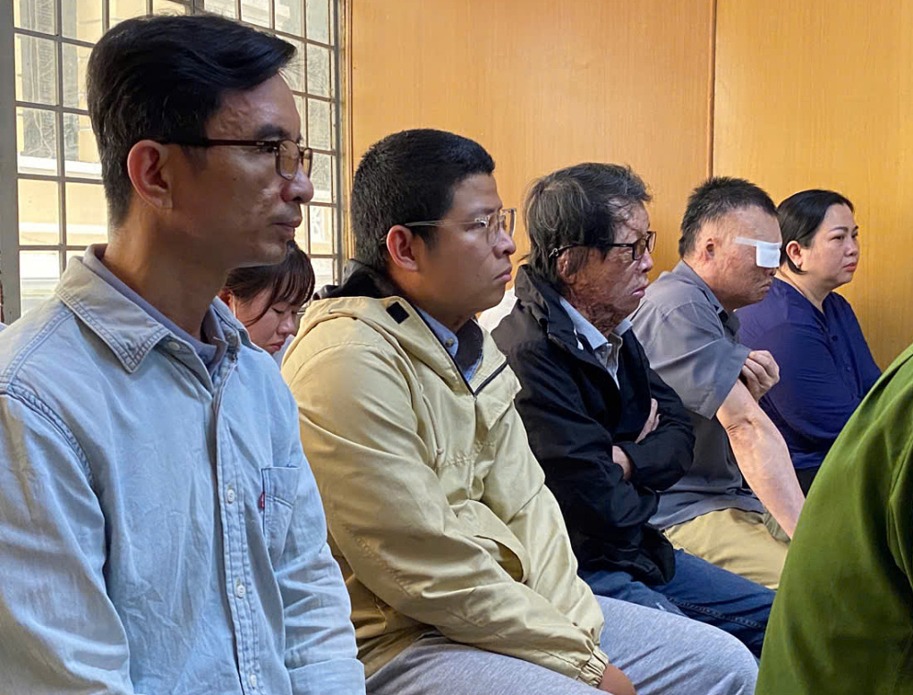 Cả 4 bị hại đều có mặt tại tòa. Trong đó, anh Tuấn phải mang di chứng nặng nhất với gương mặt biến dạng, chằng chịt sẹo, mù hai mắt.